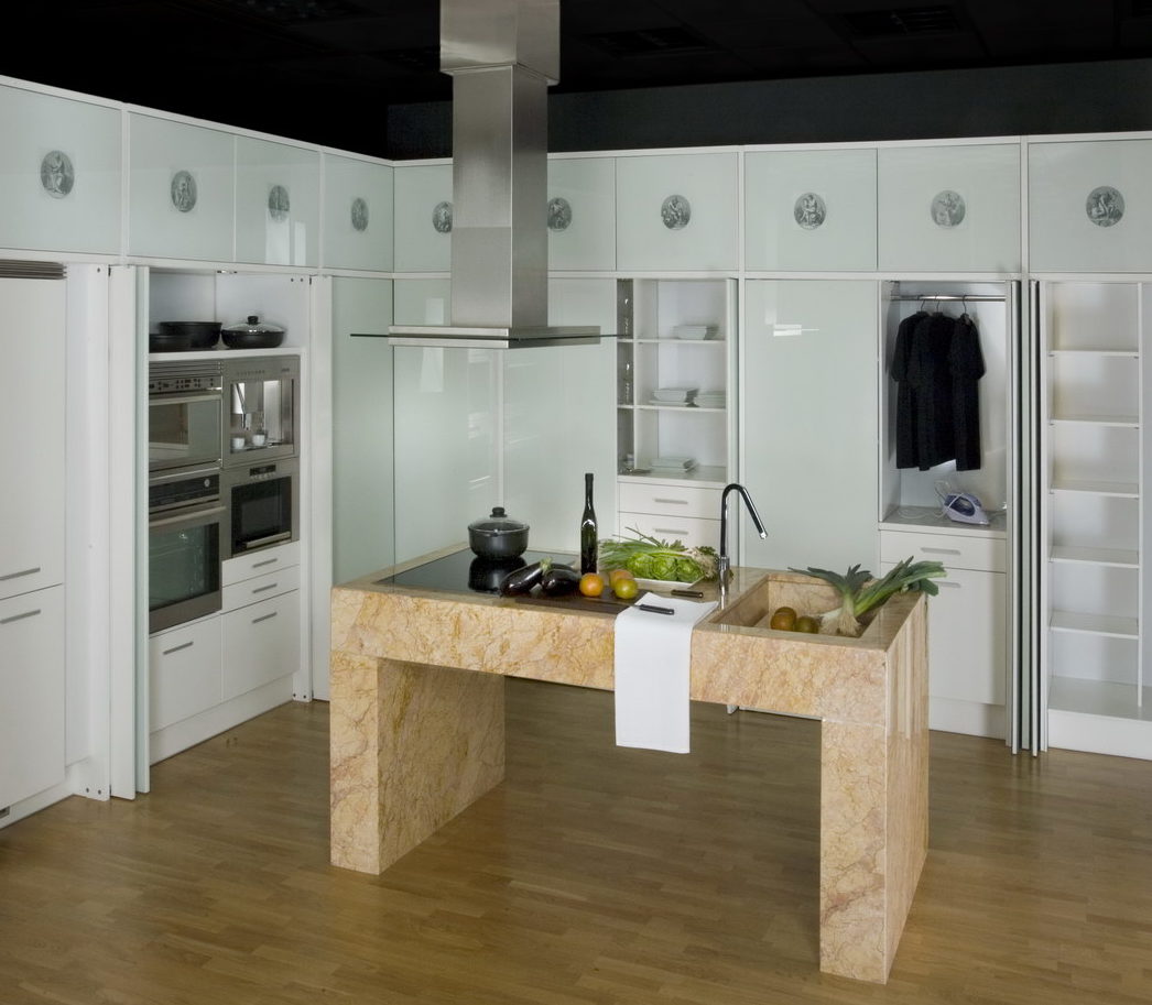 Cocina con sistema de puertas giratorias, deslizantes por los laterales, que ocultan todos los conjuntos de servicios unidos entre si y organizados para su máxima practicidad. El diseño y la estética se inspiran en criterios vanguardistas. La isla está elaborada en mármol CREMA VALENCIA, toda una pieza con rebaje en el fregadero.