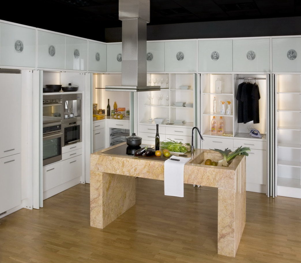 Cocina con sistema de puertas giratorias, deslizantes por los laterales, que ocultan todos los conjuntos de servicios unidos entre si y organizados para su máxima practicidad. El diseño y la estética se inspiran en criterios vanguardistas.