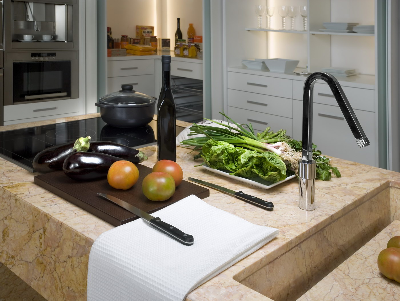 La isla está elaborada en mármol CREMA VALENCIA, toda una pieza con rebaje en el fregadero.