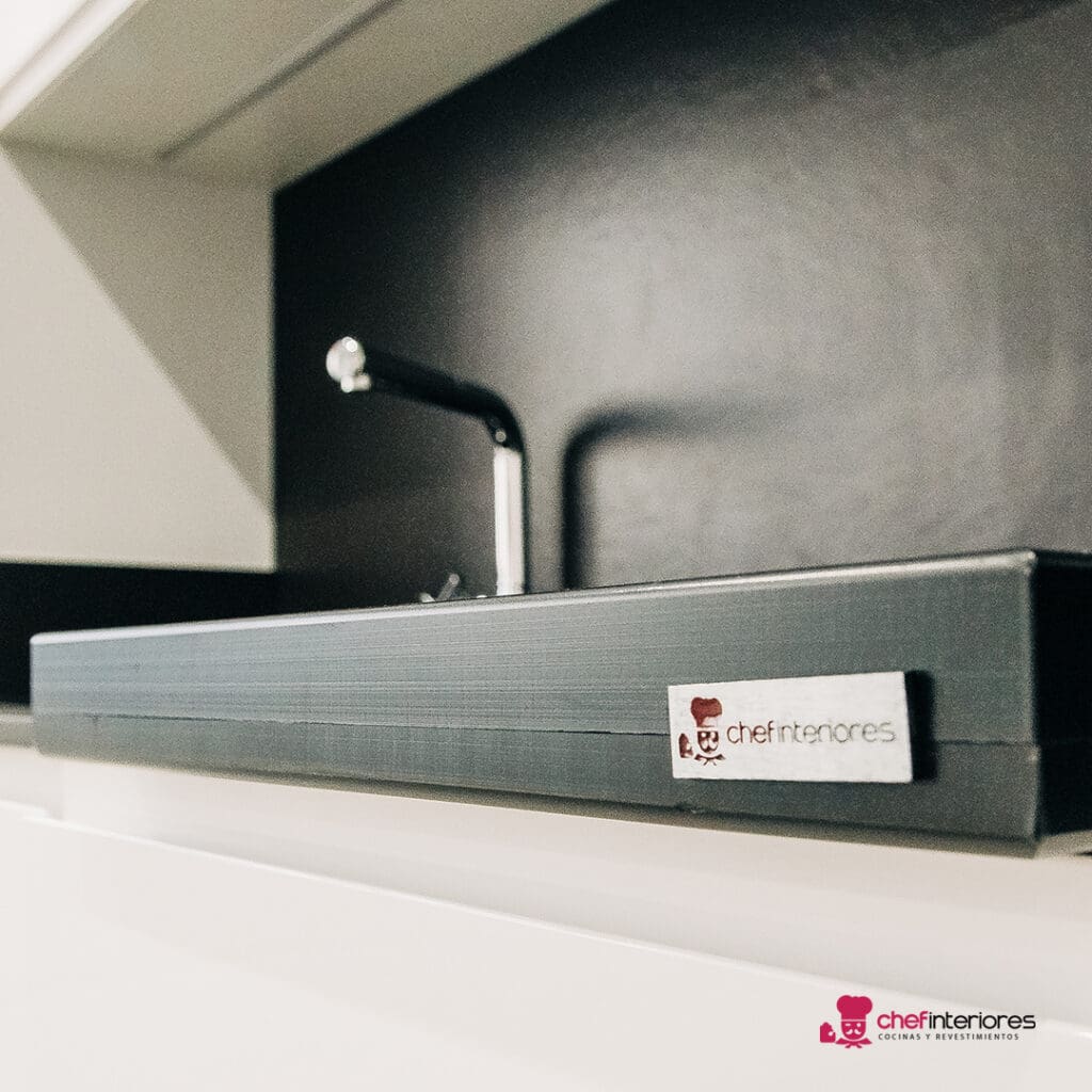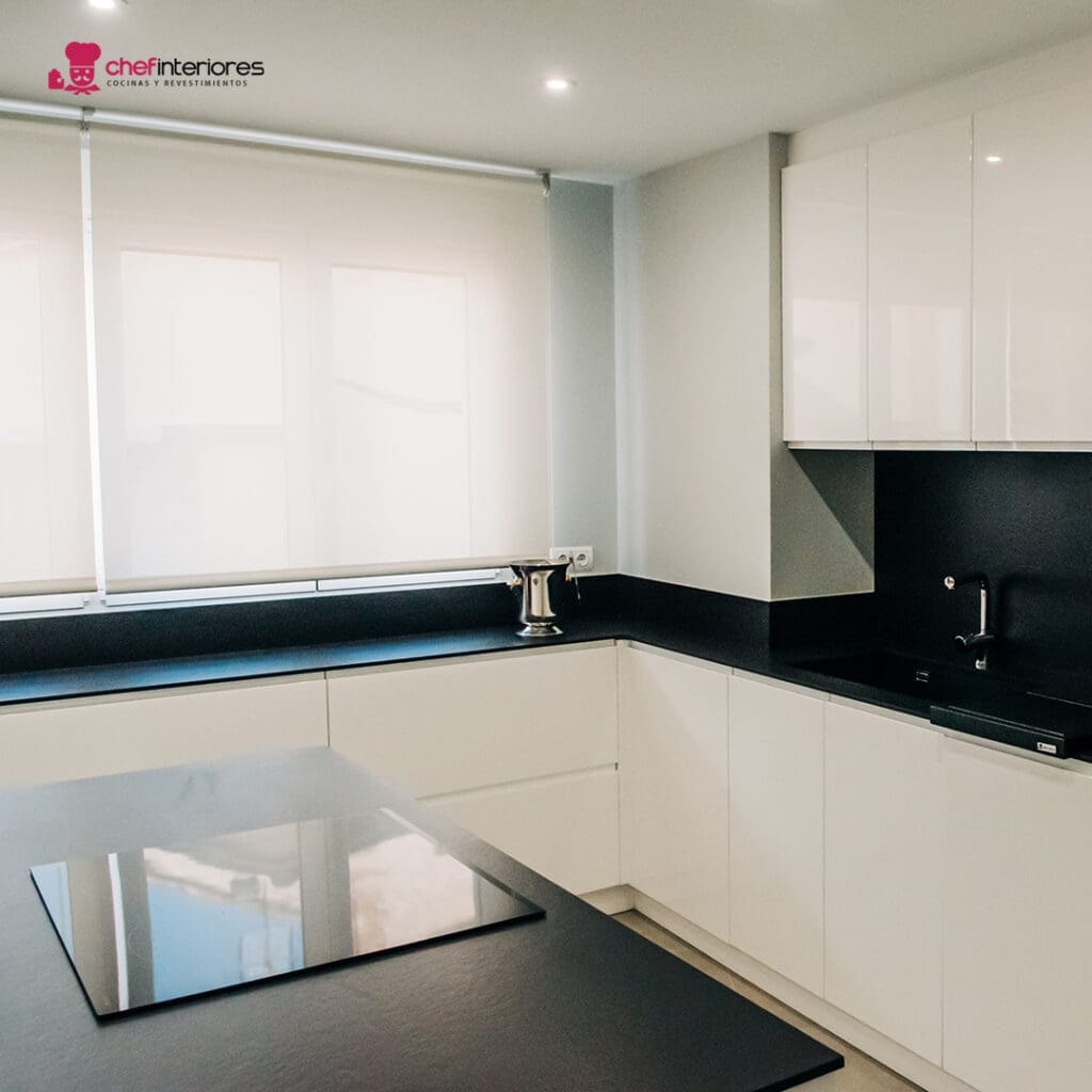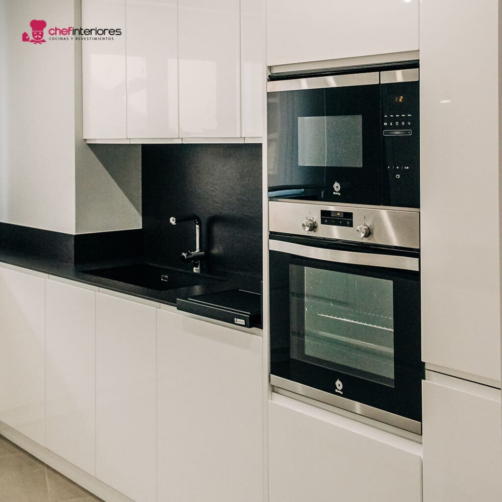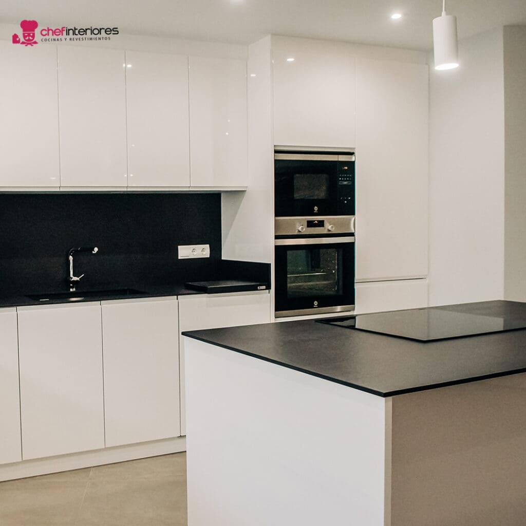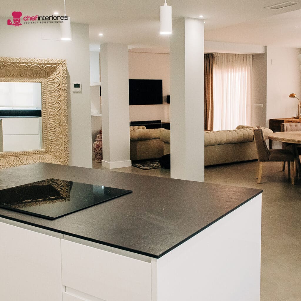 Por eso, la cocina de Chef Interiores está integrada al salón. Además, el mobiliario lacado en blanco en alto brillo también da más claridad a la estancia. La combinación del blanco con el negro del porcelánico de la bancada, siempre es un toque extra de elegancia.