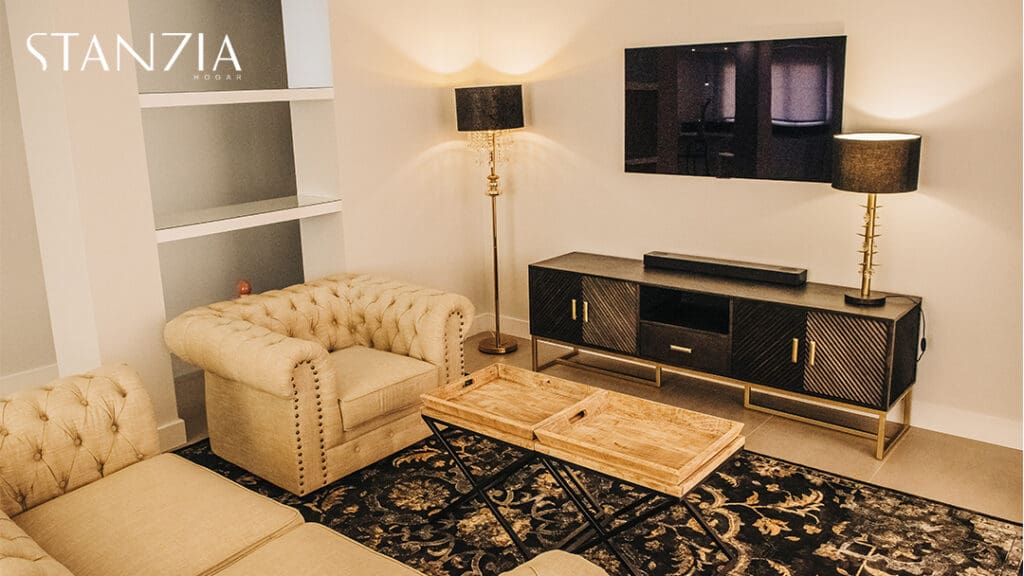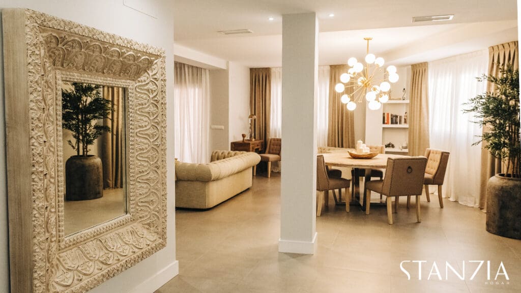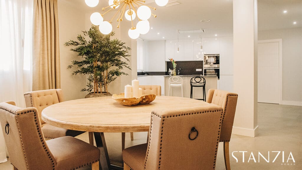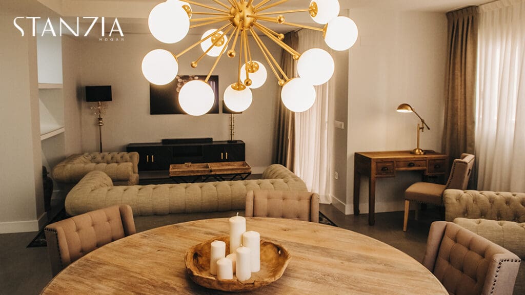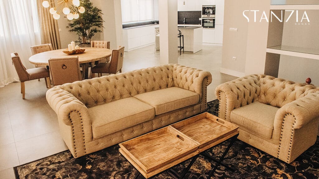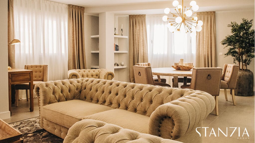 Para el salón, Stanzia Hogar apostamos por los colores neutros tan de tendencia esta temporada. El conjunto de sofás y sillones estilo chester o la mesa de madera coronada por una original lámpara de techo, captan todas las miradas. El resultado un salón comedor moderno pero señorial.